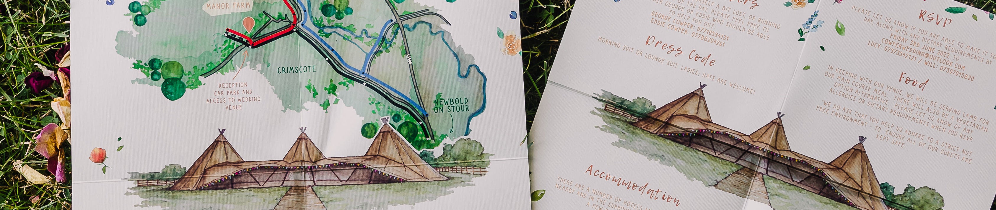 Everything I work on is illustrated by me and can include anything from cartoon versions of my couples, to venue drawings and watercolour painted wedding maps! Each design is also available on everything from wedding invites, to RSVPS and day-of items; menus, place cards and table plans.